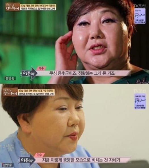 그렇게 두번의 결혼 실패를 겪은 이후 남자와의 사랑에 대해서 마음을 비웠고 결혼은 포기를 하게 되었다고 합니다. 그 속에는 바쁜 시간을 이유삼기도 했지만 경제적인 문제도 있었다고 하는데 이는 아버지가 빚보증을 잘못서며 큰 돈을 빚지게 되었고 결국 파산선고까지 받으며 많은 충격을 주기도 하였습니다. 이은하가 어렸을 때도 아버지의 빚으로 인해 힘든 시간을 보냈다고 하고 결혼까지 못하게 되는 참 안타까운 삶이 아닌가 하는 생각이 들기도 하네요. 이은하는 빚을 갚기 위해 가수 활동을 무리하게 하다가 허리 부상을 입었고 스테로이드를 맞으며 버티다가 부작용으로 '쿠싱증후군'이 생겨 몸무게가 30kg 이상 쪄서 1년만에 94kg 까지 몸무게가 올라가게 되었다고 합니다.